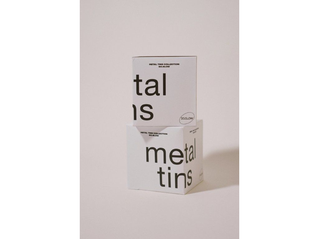 Metal Tins kolekce je nalitá do plechovek, které představují pro světlo ze svíčky novou příležitost. Světlo z plamene má dokonalou šanci svítit ve stěnách plechovky a svíčka tak prosvětluje prostor jinak než ve skle. Hliník také představue materiál, který lze nepřetržitě během života recyklovat.